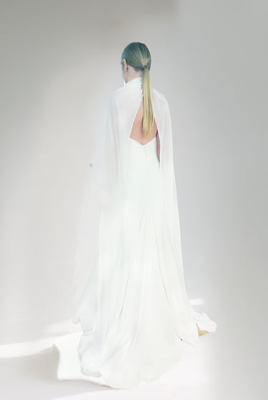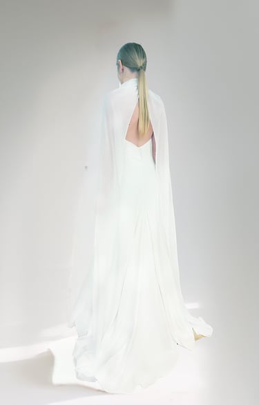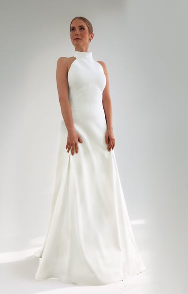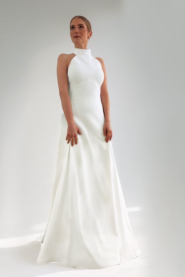 Vestido de novia con escote halter, espalda en V con drapeado y alas de seda desmontables sujetas al cuello. La falda incorpora tres godets que aportan una caída muy fluida y sofisticada. Confeccionado en un tejido mate y suave, con finísimas líneas apenas perceptibles. El patrón está pensado para ceñirse al cuerpo y estilizar la figura.