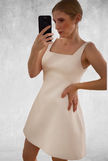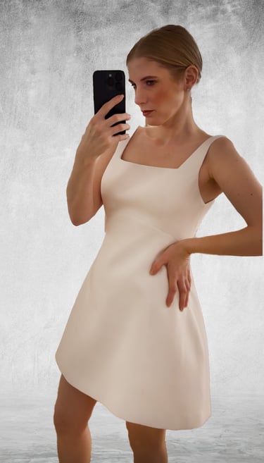 Vestido de novia corto, con realce en la cadera y corte en V invertida en la cintura que estiliza la silueta. El diseño se adapta muy bien al cuerpo, es ligero y comodísimo, y conserva un encanto súper cuqui sin perder elegancia