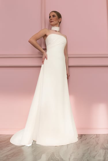 Vestido de novia palabra de honor con cuerpo drapeado en gasa y varillas interiores que aportan soporte y definición. Incluye un choker a juego también drapeado. La espalda presenta un delicado drapeado con botones forrados y se complementa con una ligera sobrecola de gasa desmontable. Un diseño elegante y sofisticado, confeccionado en un tejido suave y agradable al tacto.