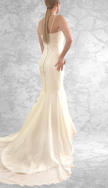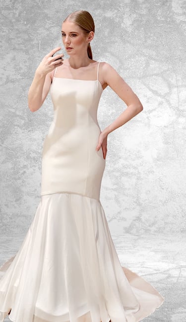 Vestido de novia de crepé sencillo y elegante, con tirantes finos y corte imperio en pico. El cuerpo combina encaje con brillo delicado, mientras que la espalda descubierta luce un escote en pico sofisticado. Con costura central en la falda, diseñada para añadir una abertura delantera si se desea. Un detalle versátil que permite personalizar el vestido y darle un toque elegante y moderno